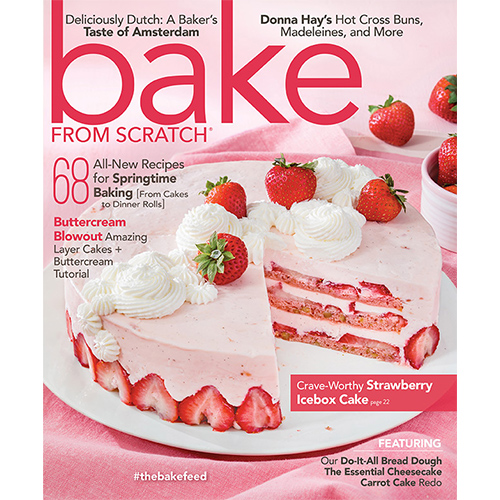 Spring is in the air, bakers! From our strawberry-loaded icebox cover star to a centerpiece-worthy blueberry star bread, this issue showcases spring’s harvest. If you’re looking for new twists on a classic, turn to our feature on carrot cake, where we reinvent this springtime staple in four epic ways. Become a cheesecake champ with our step-by-step guide to perfect New York-style cheesecake, or refine your cake-decorating skills thanks to Erin Clarkson’s deep-dive on buttercream. Don’t miss an exclusive collection of recipes by Donna Hay—Australia’s reigning baking queen and renowned cookbook author—where she shares never-before-published recipes for traditional hot cross buns, lavender-scented madeleines, and more. Because spring is one of our favorite times of year for travel, we skip over the Atlantic to have a taste of the vibrant baking scene in Amsterdam, the capital city of the Netherlands, and we take a behind-the-scenes tour of the Bob’s Red Mill factory in Milwaukie, Oregon. Whether you’re digging into our cream cheese-filled chocolate chip cookies or our strawberry-studded almond cake, this spring promises to be sweet.