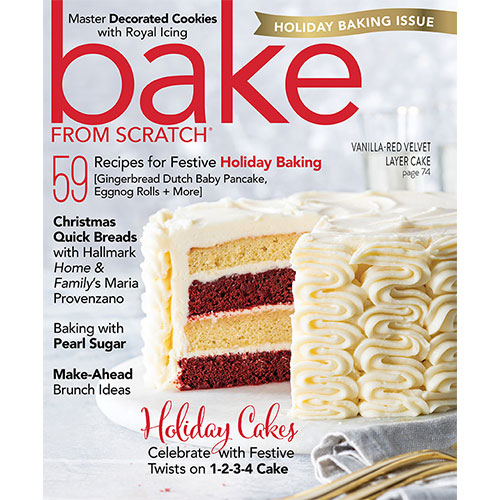 The holiday season is upon us, and it’s prime time for preheating your ovens and baking! This issue embraces that baking spirit with festive holiday cakes, including twists on 1-2-3-4 cakes, like our Vanilla-Red Velvet Layer Cake cover star, and our editor-in-chief’s Basque Bundt Cake—an exclusive recipe from our new The Bundt Collection cookbook! If you’re more of a cookie person during the holidays, you can flex your cookie-decorating skills with our guide to Royal Iced Cookies. Welcome yuletide joy with our Poached Pear Buttermilk Tart and more in our Very Merry Tarts feature, as well as plenty of recipes that highlight pearl sugar. To avoid being trapped in the kitchen on Christmas Day, we’ve got a make-ahead guide for sweet and savory Christmas brunch. In recognition of the current COVID-19 times we live and bake in, we have our Signed, Sealed, Delivered feature, which is dedicated to helping you make and package baked goods to easily mail to loved ones you may be separated from this year. We’re also featuring some bakers you know and love, from Carla Hall to Maria Provenzano. This issue is a great gathering of inspiration, bakers, and recipes to help you find any excuse to get busy with dough and batter this holiday season!