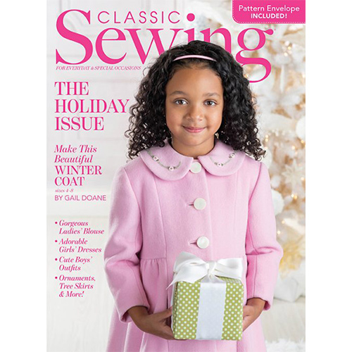 Holiday sewing is at its finest on every page of this issue. From the Gail Doane coat on the cover to the Snippets, the Christmas holidays are in full swing. The patterns, both in the attached envelope and downloads, feature festive dresses, smocking projects, and cute baby garments. There are several applique projects that will enhance your skills in applique techniques. If you are looking for adorable outfits to make for boys and girls, you will find dressy ones and casual attire. There is a sensational blouse for ladies and a fun evening bag to make.