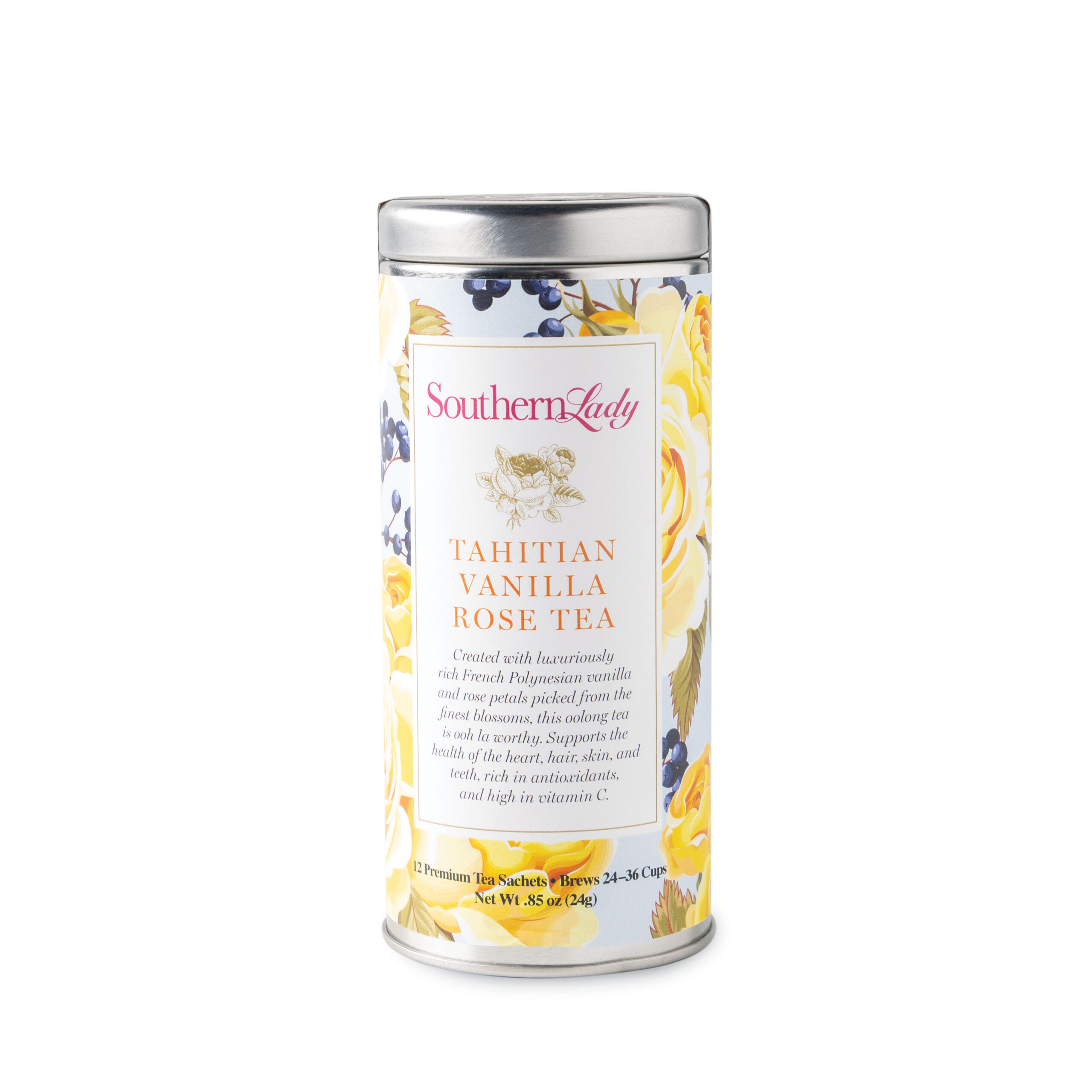 Presented in beautiful reusable tin canisters, Southern Lady Specialty Teas fill the cup with fragrance and flavor. Premium sachets allow room for tea leaves to expand during steeping, and each sachet brews two to three cups or a small teapot.