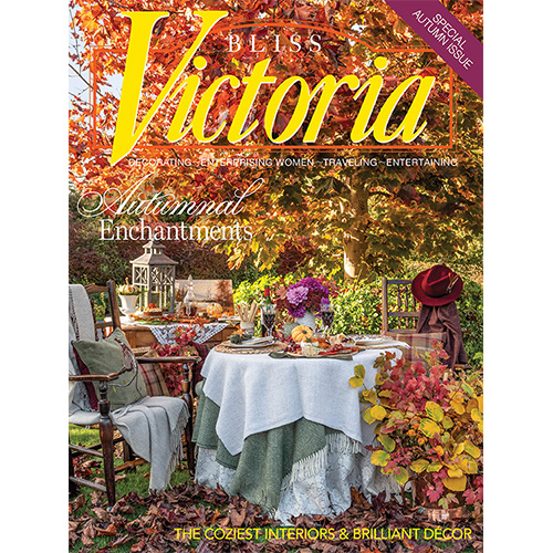 A prismatic ode to autumn, the October issue of Victoria magazine brims with the beauty of the season. Sample a feast of wine and roses perfect for sharing outdoors, an array of unforgettable appetizers highlighting harvest flavors, and a dreamy English picnic. A vibrant bounty of pumpkins and fall florals spill from our pages, and we visit the homes of Writer-in-Residence Jan Karon and Artist-in-Residence Annie Sloan. Gain inspiration in gracious spaces that reflect the talents of architecture–interior design duo Stamps & Stamps, and discover the European charms of a community in the Midwest. Plus, don’t miss an array of romantic fashions!